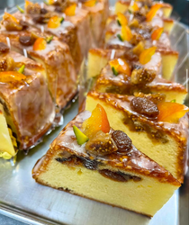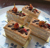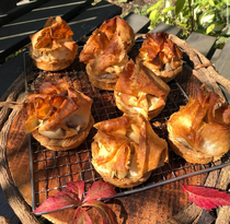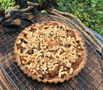 パイ生地をきつね色に焼き、その中にヘーゼルナッツとアーモンドのクリーム、パティシェ,マロンクリーム,マイヤーズラム酒潜らせた渋皮くりごろごろを、栗のシロップと、ブールフォンデュしませた生地に包みのせて、さらに香ばしく焼きます🍁