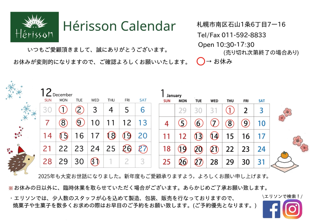 ※お休みの日以外に臨時休業を取らせていただく場合が